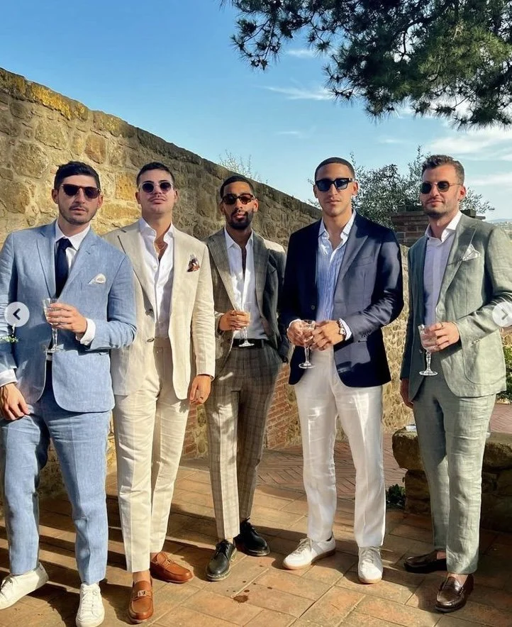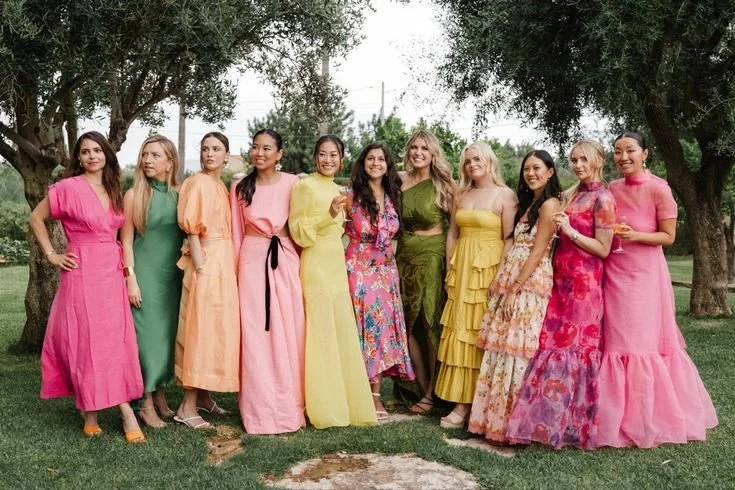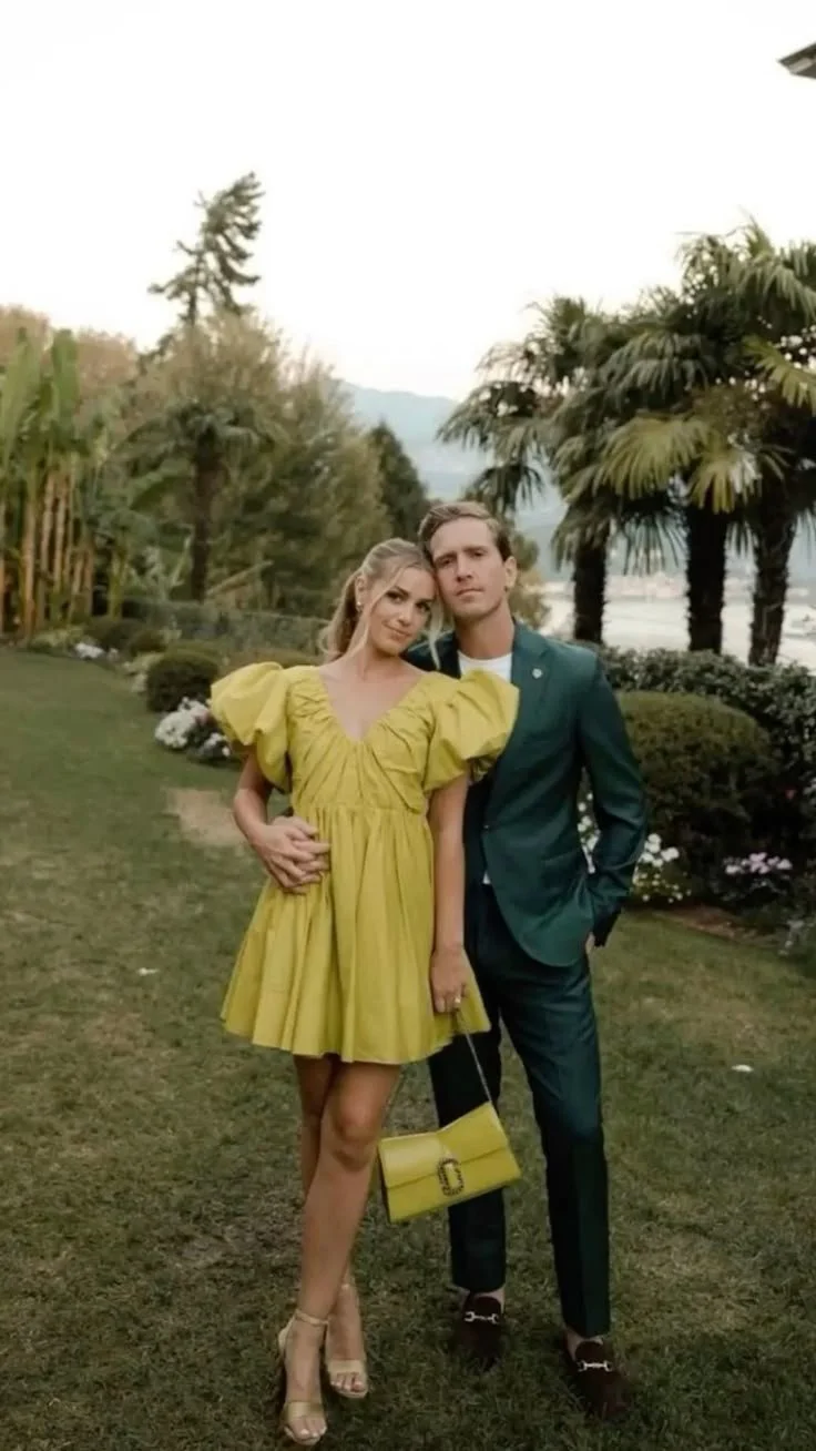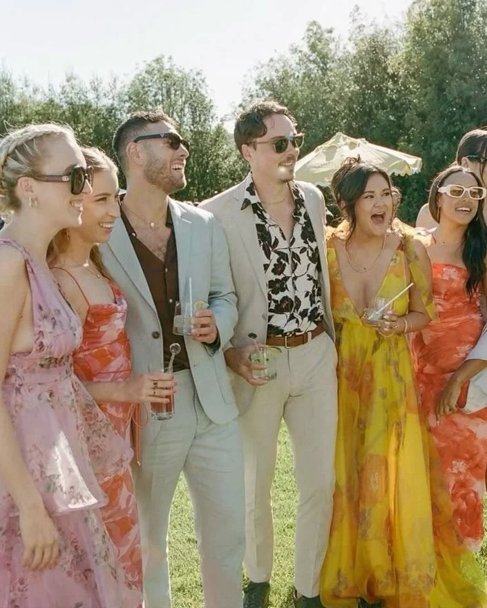 The bride and groom request festive semi-formal attire. Think colors, textures, ruffles, and florals — have fun with it! The venue is an outdoor grassy space, so plan your footwear accordingly.